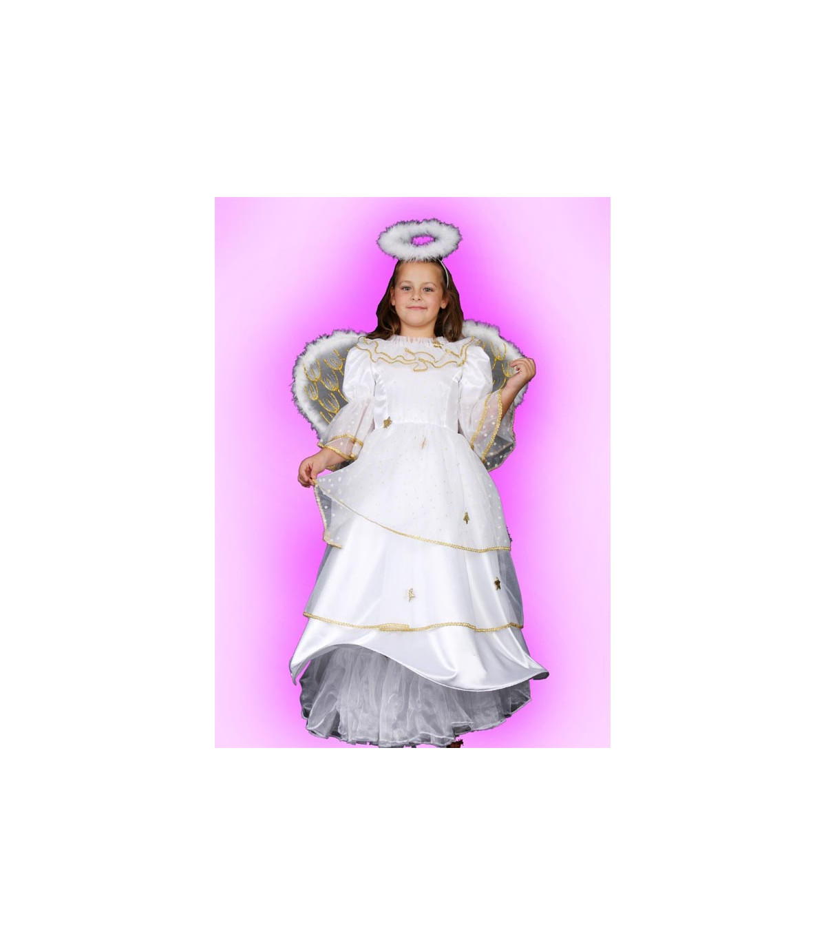 Kostým Anděl zlatý je vyroben z materiálu polyesterový satén kombinovaný s poilyesterem a nylonem - dlouhé bílo-zlaté šaty