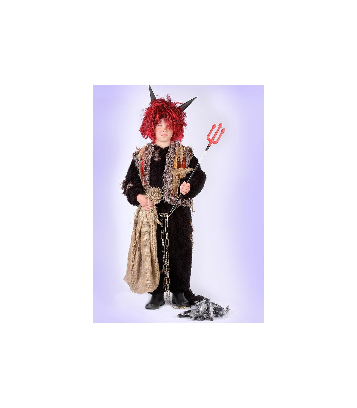 Kostým Čert dětský je vyroben z materiálu polyesterový plyš kombinovaný s barevným polyesterem a jutou - kombinéza, vesta, pytel