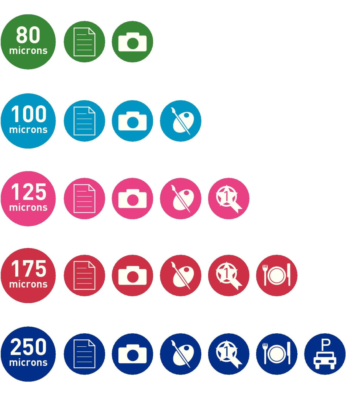 - Doporučení pro optimální laminaci: Teplota laminace (ovlivňuje tloušťka laminovaného dokumentu). 80mic (90-110°C), 100mic (100-120°C), 125mic (110-120°C), 150mic (110-130°C), 175mic (120-140°C), 250mic (130-150°C)