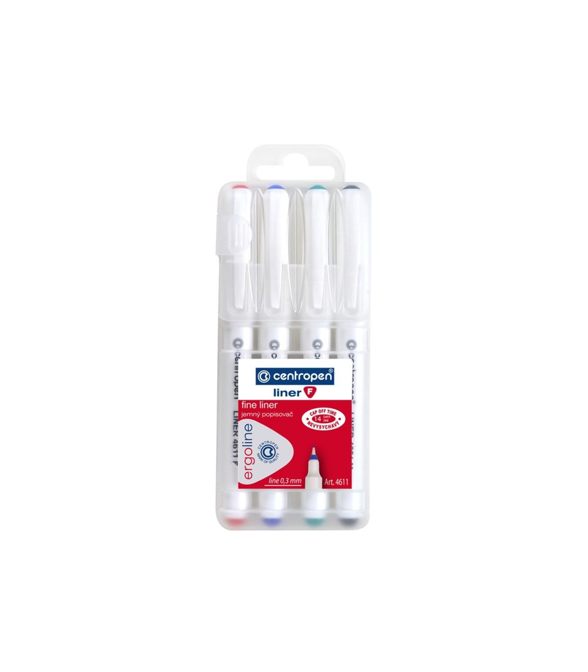 Liner Centropen 4611 F, Šíře stopy 0,3 mm, Barva mix, V novém trojhranném designu, Speciální nevysychavý inkoust, vydrží až 14 dní bez víčka, Cena za balení 4 ks