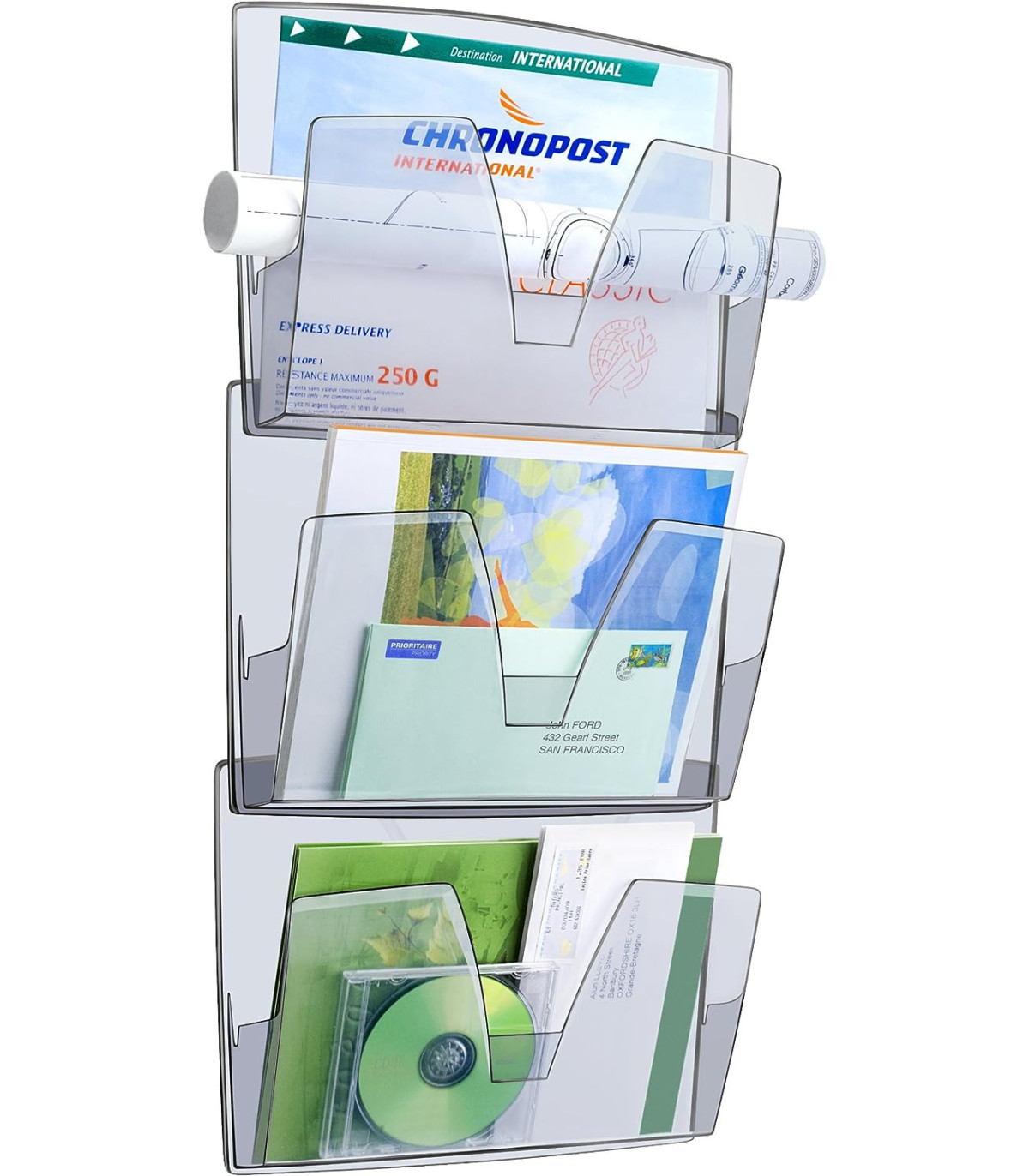 Prezentační nástěnný stojan CepPro - 3 přihrádky. Barva transparentní. Formát A4 a A3. Rozměr přihrádky pro A4: 24 x 32 cm