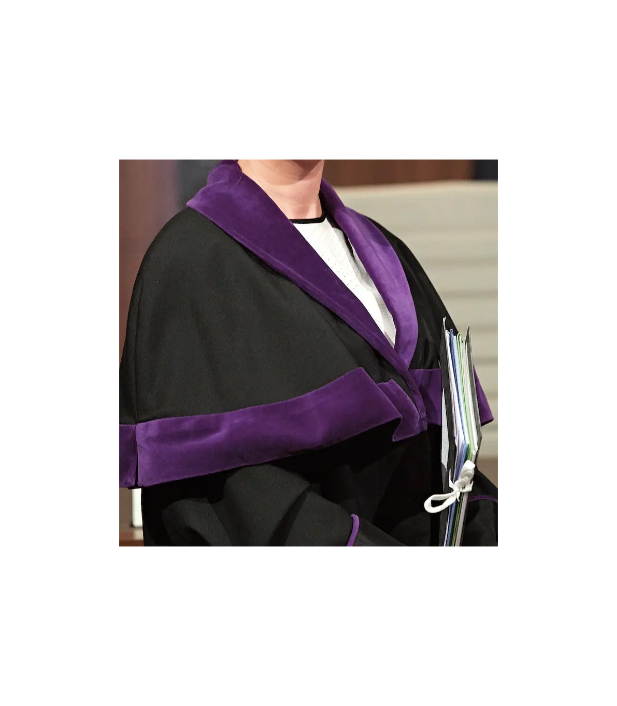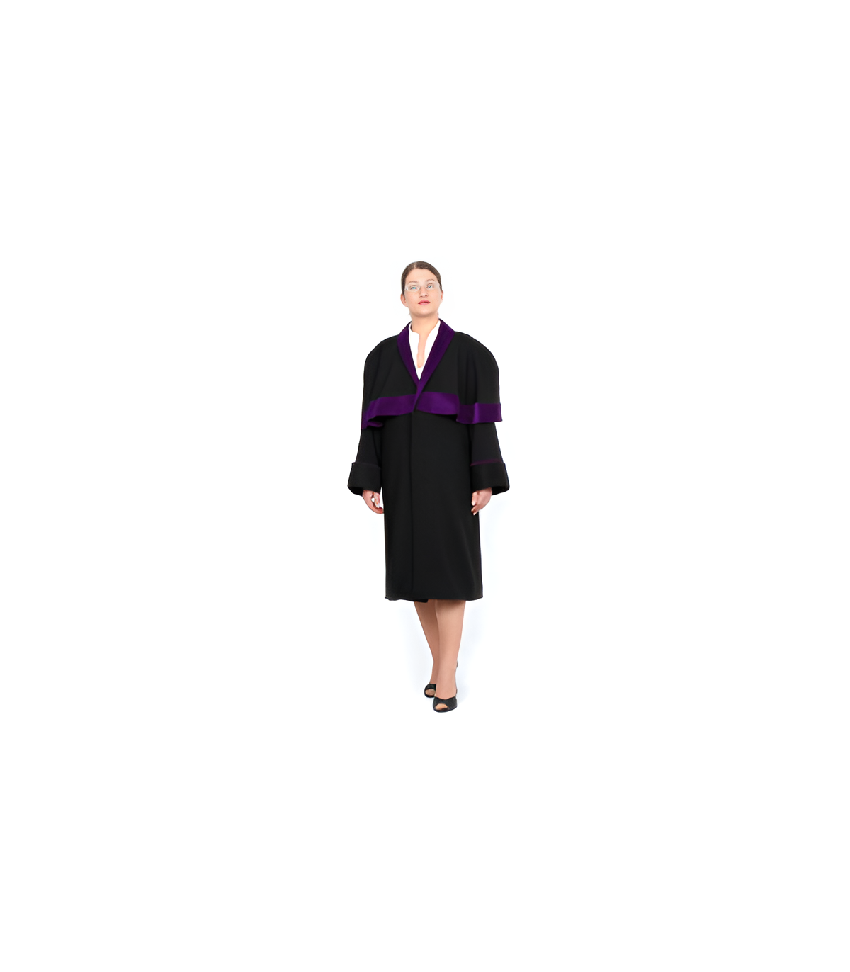 - Barva: Talár je černý s elegantním lemováním ve fialové barvě, což podtrhuje jeho profesionální vzhled.
