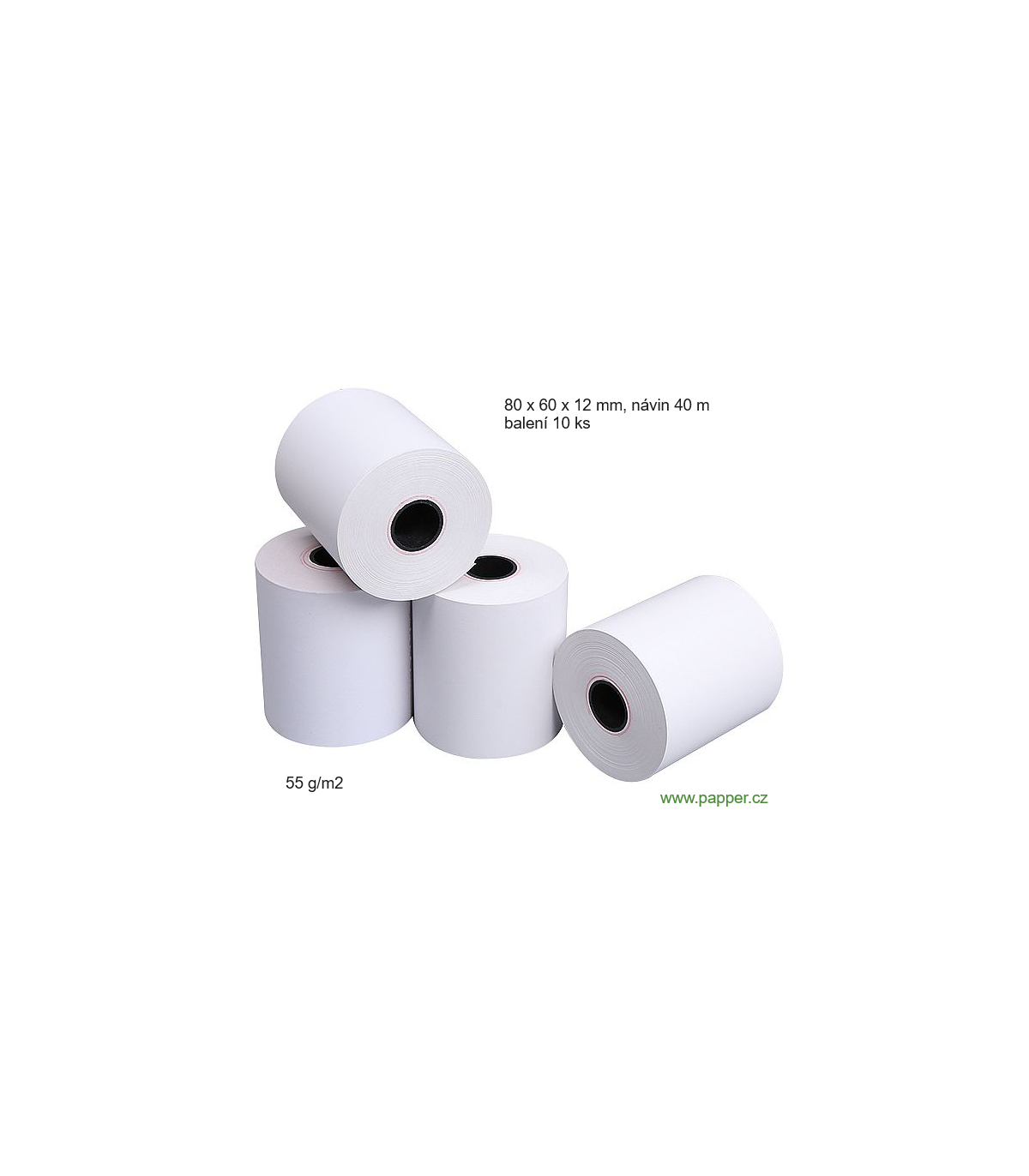 Termokotoučky - 80 x 60 x 12 mm, Kotoučky jsou vhodné do pokladen, platebních terminálů a kalkulaček zaručující maximální šetrnost k tiskové jednotce, Návin 40 m, 55 g/m2, Cena za balení 10 ks