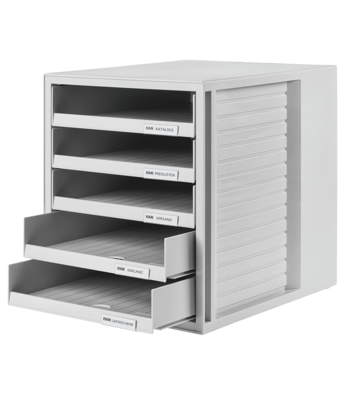 - Zásuvkový box KARMA s 5 zásuvkami na papír formátu DIN A4 a větší oceněný ekologickým certifikátem "BLUE ANGEL"