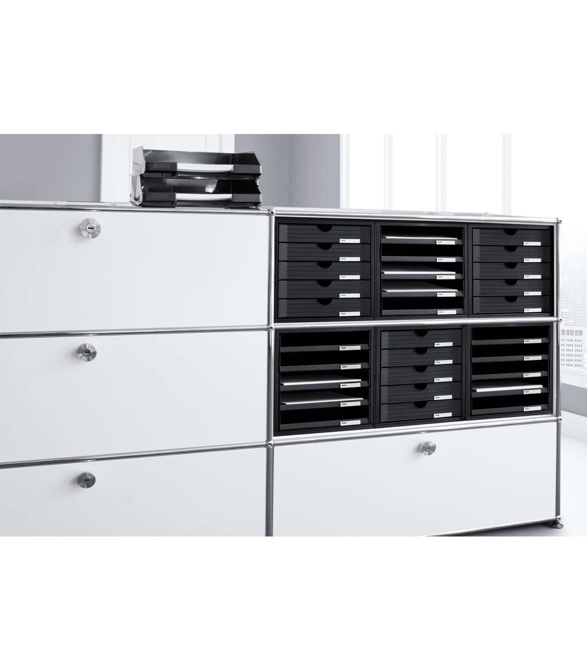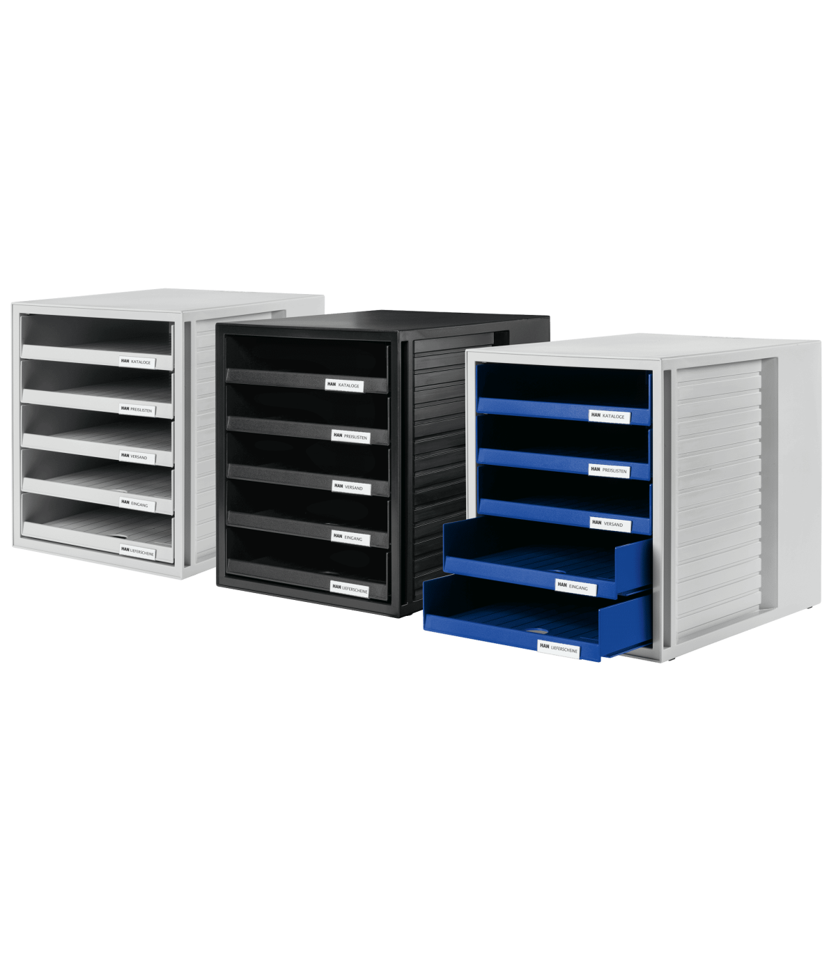 - Zásuvkový box KARMA s 5 zásuvkami na papír formátu DIN A4 a větší oceněný ekologickým certifikátem "BLUE ANGEL"